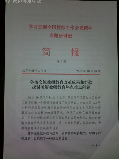 此期简报是教育部举办的学习贯彻全国教师工作会议精神研讨会的专题报道。10月29—30日全国125所本科师范院校主管教师教育的校领导交流了各校教师教育改革成果和经验,探讨破解教师教育热点难点问题。张登玉副院长在研讨会上汇报了PA视讯教师教育改革的情况,重点汇报学院近几年来依托“国培计划”有效推进教师教育培养和培训一体化的鲜活经验。