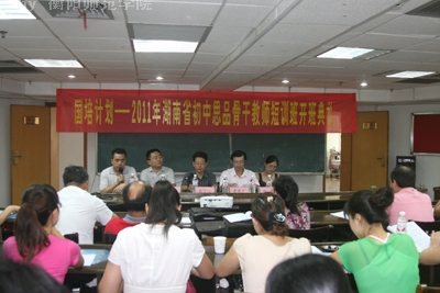 7月31日上午,2011年国培计划——湖南省初中思想品德骨干教师短期集中培训班开班典礼在衡阳市铁工校培训中心举行。出席典礼的嘉宾有学院副院长张登玉教授、继续教育学院院长涂昊博士、思想品德课程教师培训学科首席专家、思想政治理论课教学部主任廖建平教授、思想政治理论课教学部党总支书记廖新平副教授、思想政治理论课教学部副主任伍辉副教授。开班典礼由廖新平书记主持。