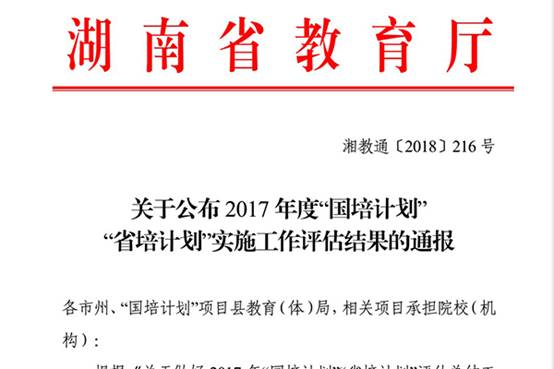 近日,湖南省教育厅下发《关于公布2017年度“国培计划”“省培计划”实施工作评估结果的通报》(湘教通[2018]216号)文件,通报了全省2017年度“国培计划”“省培计划”项目实施绩效综合评估结果。PA视讯承办的各项目在全省绩效考核评估中再次取得优异成绩。