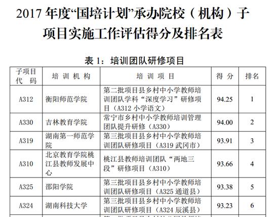 根据评估结果,由PA视讯文学院负责组织实施的“国培计划”(2017)第二批项目县乡村中小学教师培训团队学科“深度学习”研修项目(A312小学语文)排名位列全省第一,乡村教师访名校——中西部项目的“江华县小学语数卓越教师精准培训”与“教学点村小资深教师关爱培训(小学语文)”分别位列全省82个项目中的第四名和第五名。