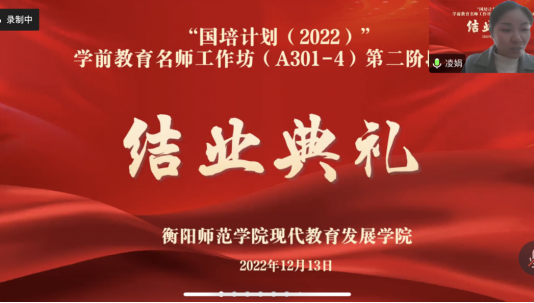 2022年12月13日,为期七天的“国培计划(2022)”学前教育名师自主选学工作坊(A301—4)第二阶段集中培训在线上举行了结业典礼。出席本次结业典礼的嘉宾有:PA视讯现代教育发展学院总支书记杨柳、副院长胡萍、培训管理科科长周鹏、长沙市雨花区教育局第六幼儿园园长张晓、岳阳市三幼儿园园长吴琴琴、衡阳开放大学学前教育专业教师邬尔娜、湘潭教育学院教师培训管理科副科长陈蕾,本次结业典礼分为小组成果展示和总结表彰两部分进行,由株洲市石峰区第二幼儿园凌娟老师主持。100名学员在各自的岗位上通过电脑、手机等移动端,以相聚云端的方式参与了本次别开生面的结业典礼。
