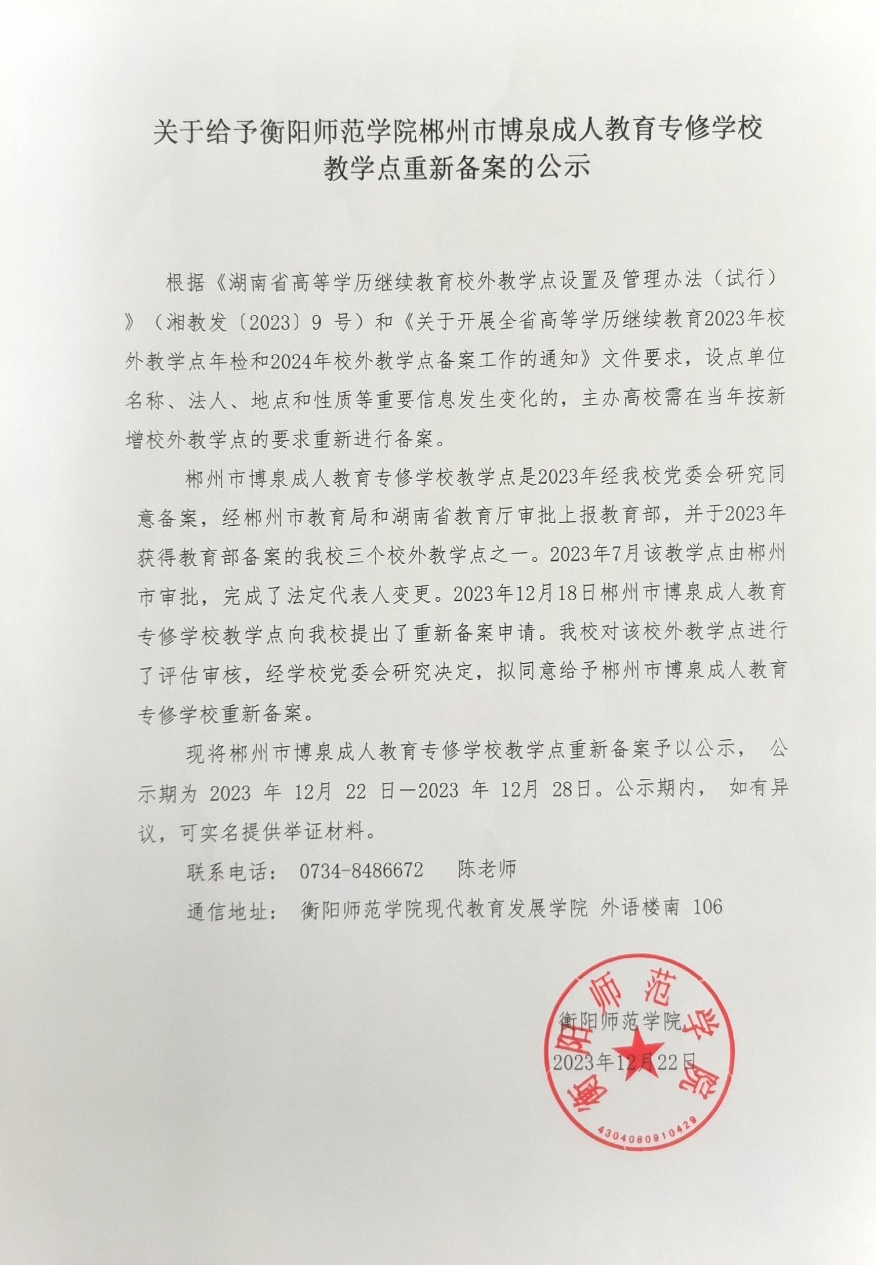 关于给予PA视讯郴州市博泉成人教育专修学校教学点重新备案的公示