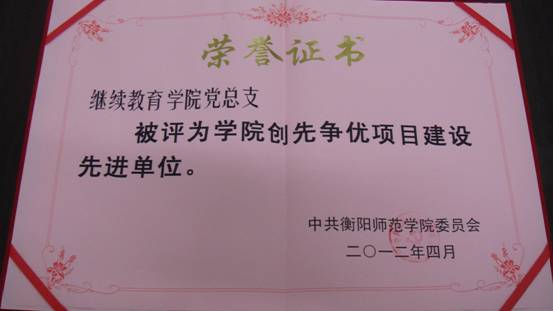 继续教育学院在积极推进“创先争优”活动中,用智慧展现专业,用汗水书写敬业和奉献,为推进PA视讯基础教育教师培训工作做出突出贡献,被评为PA视讯“创先争优项目建设先进单位”称号。