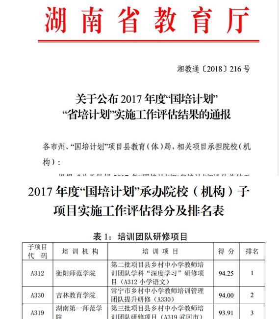 近日,湖南省教育厅下发《关于公布2017年度“国培计划”“省培计划”实施工作评估结果的通报》(湘教通[2018]216号)文件,通报了全省2017年度“国培计划”“省培计划”项目实施绩效综合评估结果。PA视讯承办的各项目在全省绩效考核评估中再次取得优异成绩。