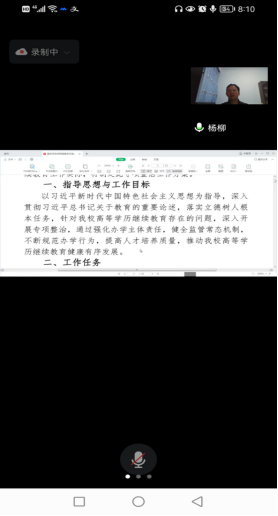 10月14日在刘俊学副校长的指导下,召开校外教学点高等学历继续教育专项整治工作部署视频会议,强调和推进专项整治工作。PA视讯八个教学点负责人、现代教育发展学院领导、办公室及函授教育科所有同志参加会议。会议由PA视讯书记杨柳教授主持,会议一起学习相关文件和《PA视讯高等学历继续教育专项整治工作方案》。要求提高政治站位、强化政治担当,坚持问题导向,聚焦突出问题,全面梳理,查摆问题,做到边查边改、立行立改、彻查彻改。会议研讨整治工作推进和贯彻落实的相关问题,对标对表强化落实。