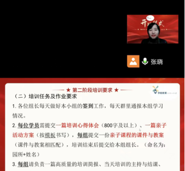 开班仪式结束后,工作坊第一次线上培训正式开启,长沙市雨花区教育局第六幼儿园园长张晓以《探索幼儿园家园合作新模式》为题,围绕家园合作的内涵与意义、建立家园桥梁、借力亲子活动、巧用信息技术四大板块进行了一场内容丰富、富有启迪的精彩分享,学员们纷纷表示,张园长的分享为往后开展家园共育工作带来了新思路,让他们对新时代幼儿园家园共育工作有了更深刻的理解。