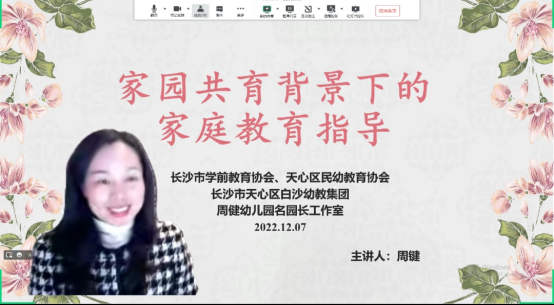 下午的学员主持是来自邵阳市岩山镇中心幼儿园的左文老师,在她热情洋溢的介绍下,长沙市天心区教育局白沙幼教集团总园长周健以《家园共育背景下的家庭教育指导》为题开启她的专题授课。周园长为学员们深入浅出的辨析了幼儿园教育与家庭教育的关系,结合生动案例向大家分享了在家园共育中实施家庭教育指导的有效策略。学习虽在云端,但学员们全程认真关注,聊天区积极互动的热情不减,学习结束后大家纷纷表示获益匪浅。