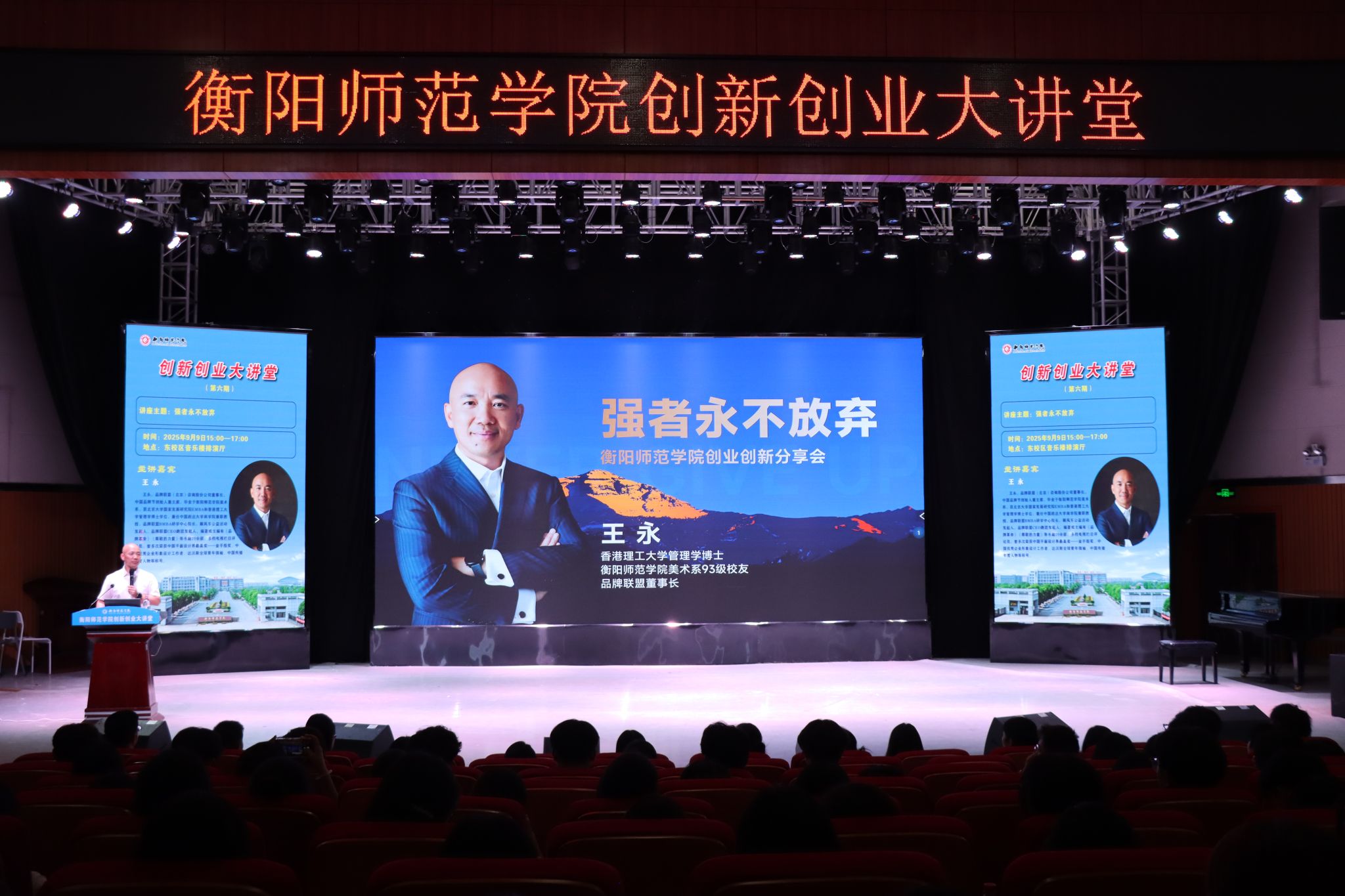 王永以“强者永不放弃”为主题,结合自身创业故事,以及对“创业”一词的独特理解,为师生带来了一堂融合校园实践、创业经验与人生智慧的讲座。