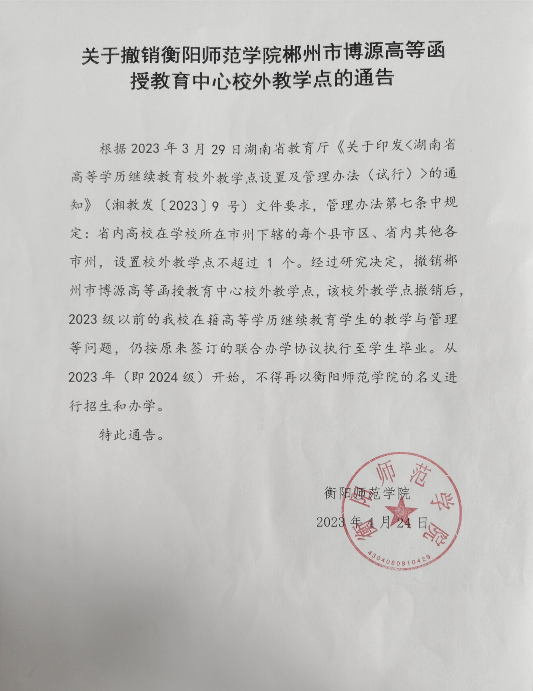 关于撤销PA视讯郴州市博源高等函授教育中心校外教学点的通告