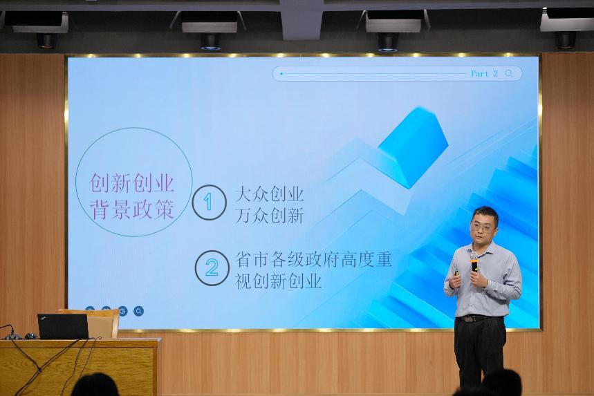 作为受聘导师,衡阳造·工创谷总经理刘浩简要地阐释了工创谷的职责和使命。他通过“资源对接—项目孵化—市场落地”的三维模型,展现工创谷如何为大学生插上梦想翅膀,并呼吁学子积极参与,“让创意从实验室走向社会,让青春与时代同频共振”。接着,湖南省创业导师王彬作为主讲人,凭借其在双创项目辅导以及企业孵化服务领域多年积累的丰富经验,从政策背景、创新创业本质、双创大赛常见误区以及隐藏加分项四个方面,对大学生创新创业进行全方位解读。他结合自身丰富的评审经验和实际案例,详细讲解了从竞赛到创业,从选题到组建团队,再到实践的相关内容。讲座内容丰富、讲解深入浅出,既有理论高度、又有实践深度,为师生们提供了“及时雨”般的指导;在场师生纷纷表示收获颇丰、受益匪浅,对今后参加创新创业赛事充满了信心。