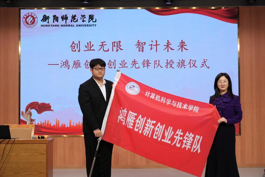 仪式伊始,党总支书记何志红以《立鸿雁之志,创时代新篇》为题发表讲话,她指出,先锋队的成立不仅是学院深化“双创”教育的重要实践,更是计科学子以鸿雁之姿拥抱时代机遇的崭新起点。围绕“鸿雁精神”,何书记提出三点期望:一是以“鸿雁之志”,读懂湖南省“七个一”创业政策机遇,把握时代风口;二是以“领头雁”引领“雁阵群”,在时代答卷中积极担当作为;三是将校训“厚德博学,励志笃行”融入创业实践,传承湖湘敢为人先的精神血脉,在时代的苍穹下“书写属于中国青年的壮美轨迹”。致辞结束后,何志红书记为鸿雁先锋队授旗,大队长罗浚誉庄重地接过旗帜,标志着计算机科学与技术学院鸿雁大学生创新创业先锋队正式起航。