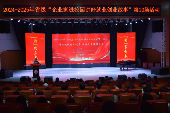 4月24日下午,由湖南省教育厅主办的“企业家进校园讲好就业创业故事”第10场活动在PA视讯东校区音乐厅举行。PA视讯各学院党总支书记、分管创新创业工作副院长以及学生代表400余人参加了此次活动,活动由PA视讯创新创业与继续教育学院院长唐斯萍主持。